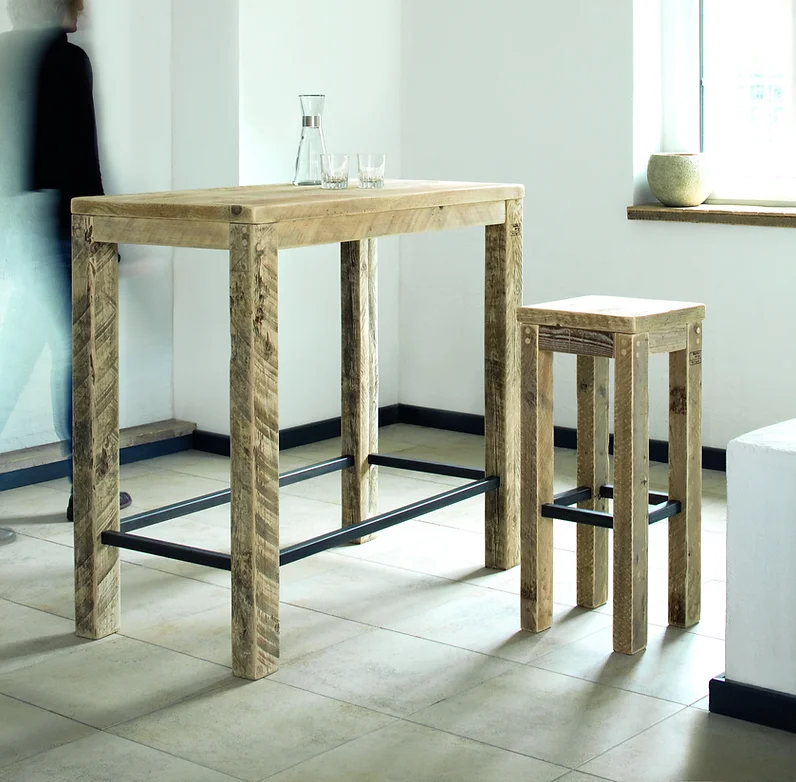 BAUHOLZ design DAS ORIGINAL Stehtisch OSCAR. Der solide Stehtisch mit Kantholzfüßen und Fußraste aus Edelstahl.