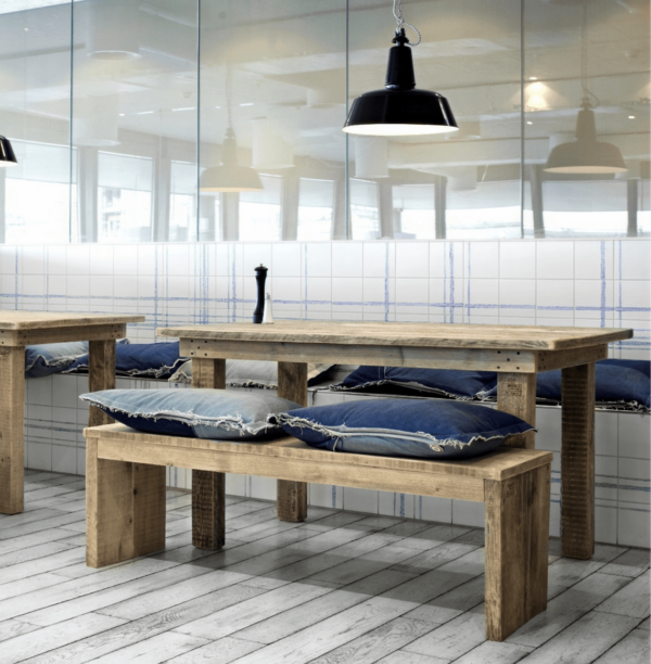 Die gebrauchten Bauholzbohlen haben alle einen individuellen Charakter, somit wird jede Bank zu einem Unikat.